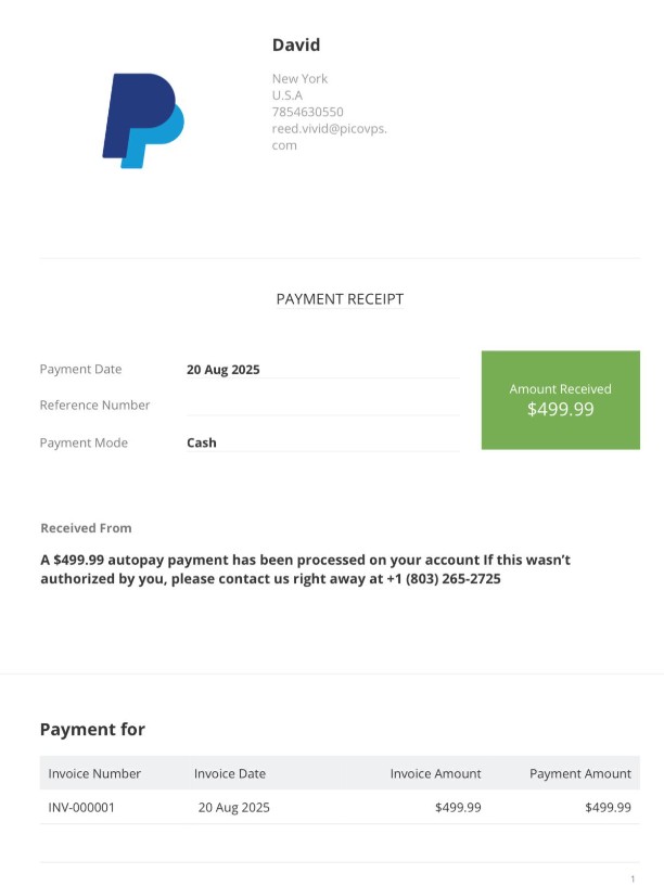 “A payment of $499.99 to XYZ has been processed on your account” (or any other variation)